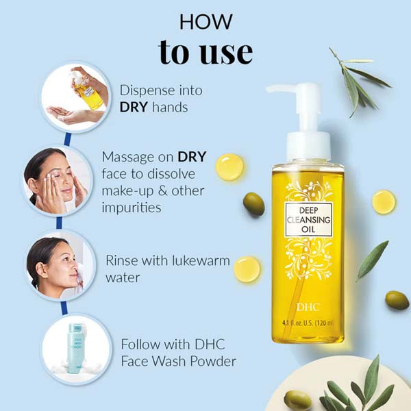 1. Deep Cleansing Oil. Dispense 2-3 pumps into dry hands, then massage onto dry face to dissolve makeup and other impurities. Rinse thoroughly with lukewarm water.